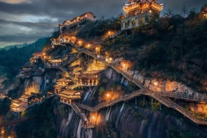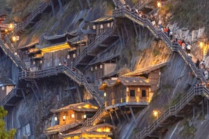 一栋栋古朴的民宿错落有致地镶嵌在悬崖峭壁之上,与自然山水完美融合。夜晚,灯光亮起,宛如繁星点点,美不胜收。