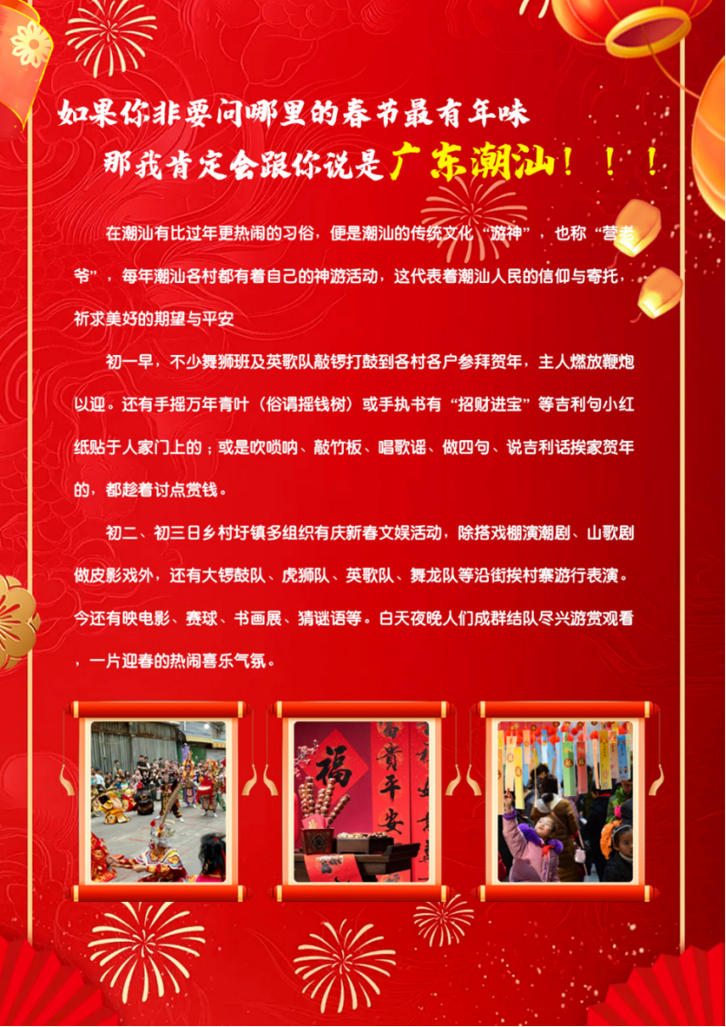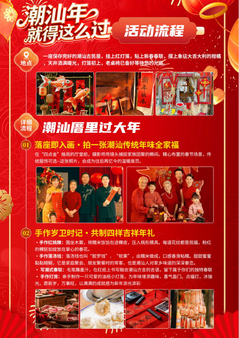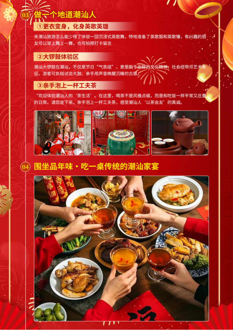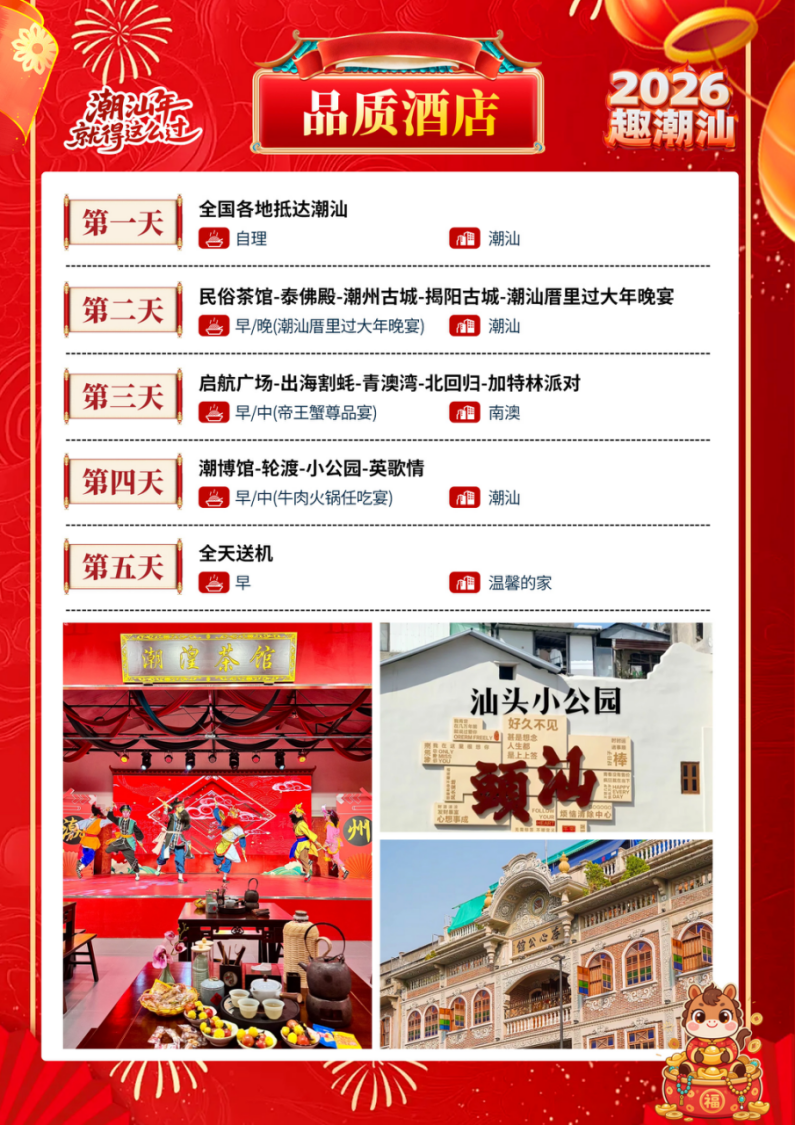 欢迎来到广东·参加潮汕年就得这么过系列产品;祝各位贵宾马年平安顺!抵达潮汕后,安排接送前往酒店办理入住;随后自由互动;