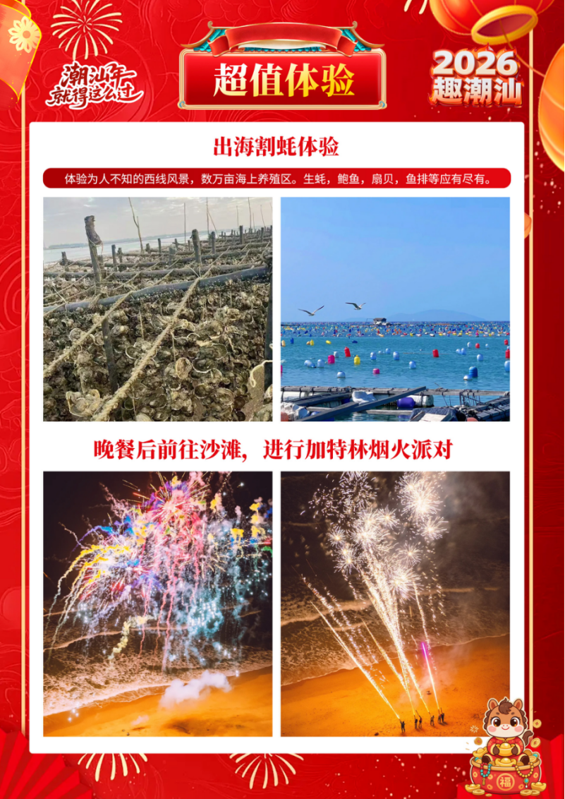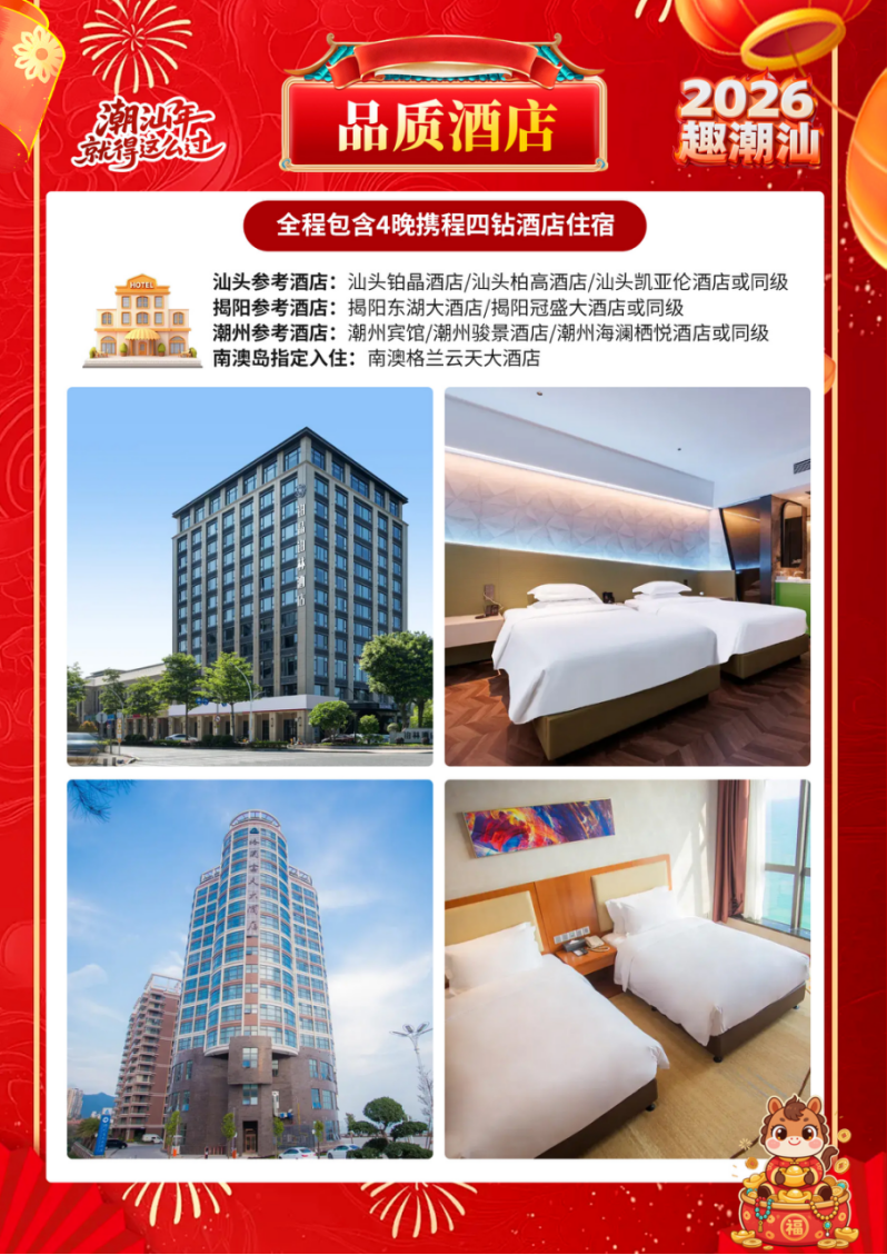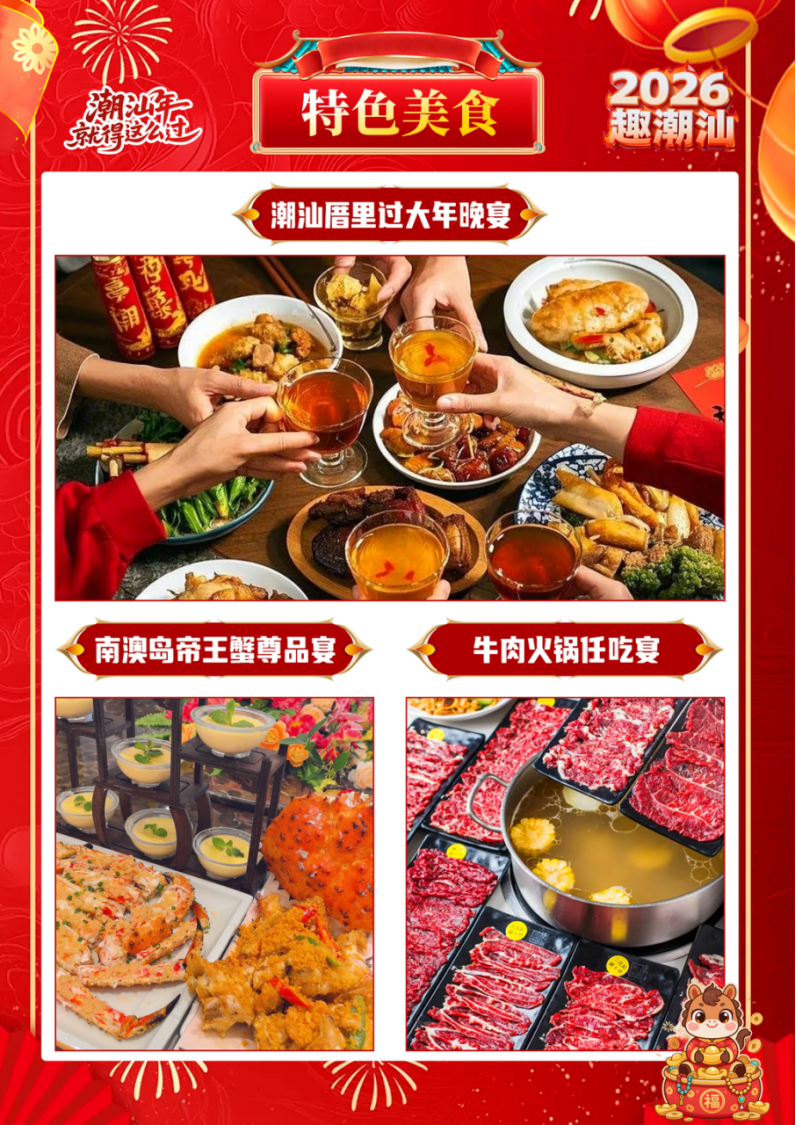 4、【餐饮】用餐共4早3正;潮汕厝里过大年200、南澳岛帝王蟹尊品宴100、牛肉火锅任吃宴80 。