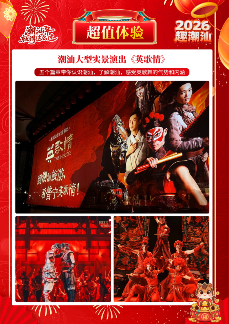 游览潮州文旅新地标——【潮州民俗演艺馆】,震撼的潮州英歌舞、潮州大锣鼓、营老爷、舞狮表演、典雅的潮剧经典选段、精妙的非遗技艺展示等表演,让游客最沉浸最地道的潮汕文化。