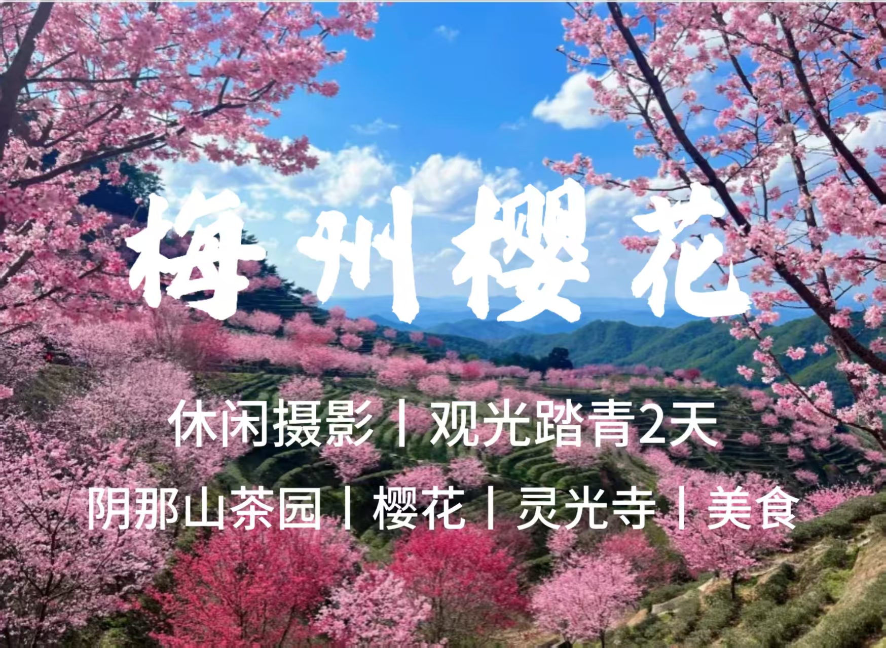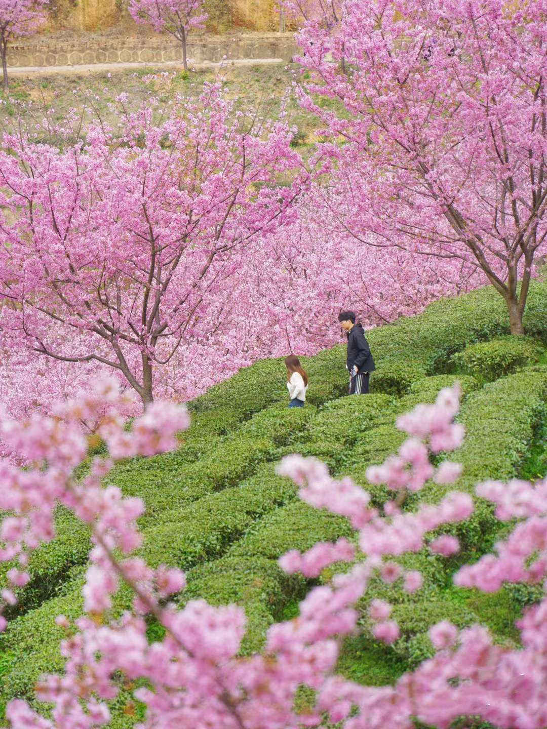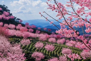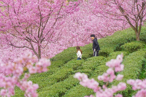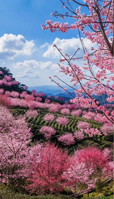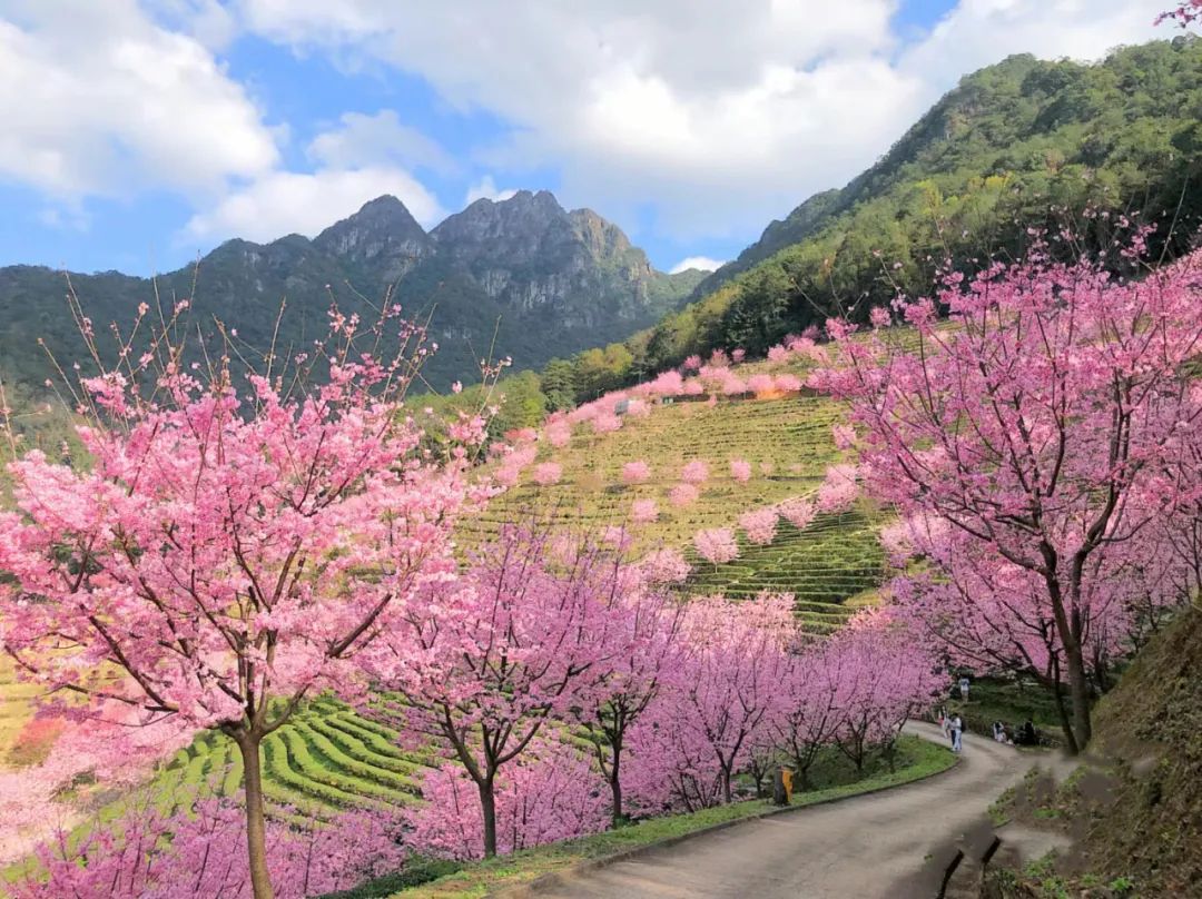 千亩茶园,万株樱花,迎春暂放,漫山遍野的粉色花朵,点缀在四季常青的茶园内,层层叠叠,烂漫无比,深深吸上一口充满花香与茶香的空气,沁人心脾。